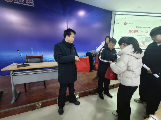 温情寄语后,暖心礼包发放环节将活动氛围推向高潮。田文强、刘传虎、张涛与毕业班辅导员们一同上前,为每一位学子递上精心准备的考研助力大礼包。礼包内涵丰富,既有寓意“苹”“苹”安安的苹果、心想事“橙”的橙子和“巧”克难关的巧克力,也有实用的文具袋和写满温情祝福的鼓励卡片,每一份礼物都承载着学院对学子的深切关怀与殷切期望。