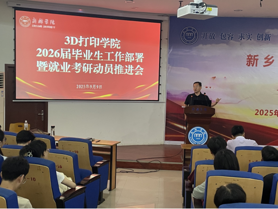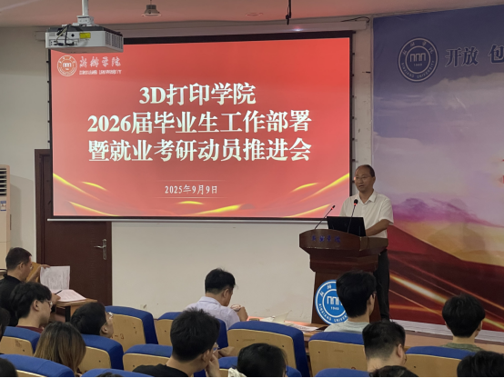 9月9日下午,3D打印学院在A-05报告厅举行2026届毕业生工作部署暨就业考研动员推进会。3D打印学院学院党委书记田文强、副书记刘传虎、副院长李在林、辅导员代表和2026届全体毕业生共同参加大会,会议由刘传虎主持。