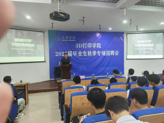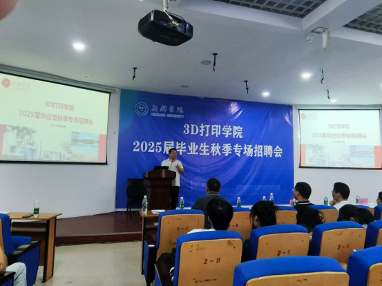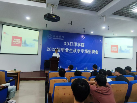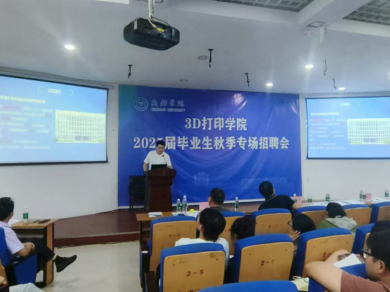 为进一步巩固2024年招生就业工作的成果,扎实做好2025届毕业生就业工作,促进毕业生更高质量、更充分就业,9月7日下午3点半,3D打印学院在A05报告厅举行2025届毕业生秋季第一场专场招聘宣讲会。受我院提前邀请的广东恒锐科技集团有限公司总经理樊伟超、技术总监刘坚、苏州博理新材料科技有限公司市场总监张真、芜湖谷戈尔自动化科技有限公司总经理钱阵等6家用人单位的领导出席招聘宣讲会,我校招生就业处副处长张长会、3D打印学院党委书记田文强、院长片春媛出席招聘宣讲会,毕业班辅导员武斌、司艳芳,就业专管员方子春和2025届全体毕业生共同参加宣讲会,宣讲会由3D打印学院党委副书记刘传虎主持。