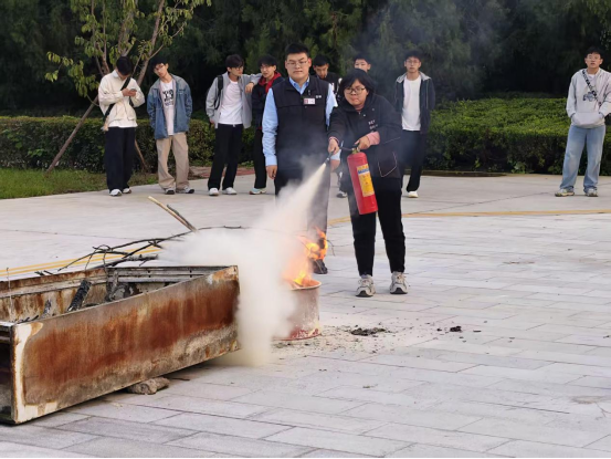 疏散环节结束后,全体师生在博雅广场开展了灭火器实操演练。张川教官向师生们现场讲解并演示了干粉灭火器的正确操作步骤——“提、拔、握、压”,以及消防水带的快速连接与使用方法。在专业人员的指导下,学院教师代表、后勤安保人员及学生志愿者纷纷上前,亲身体验了使用灭火器扑灭模拟初起火源的过程。这种理论与实践相结合的培训方式,有效激发了师生们的参与热情,使抽象的消防安全知识变成了具体的实战经验,有效提升了大家的实际操作能力。