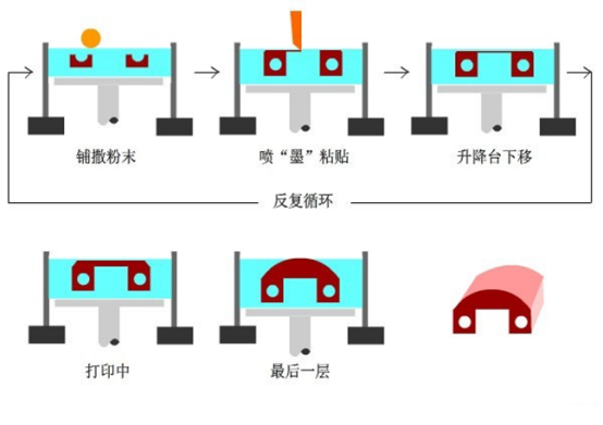 动态示意:3DP技术工作流程示意图:铺粉 -> 喷射粘合 -> 重复循环 -> 后处理取件